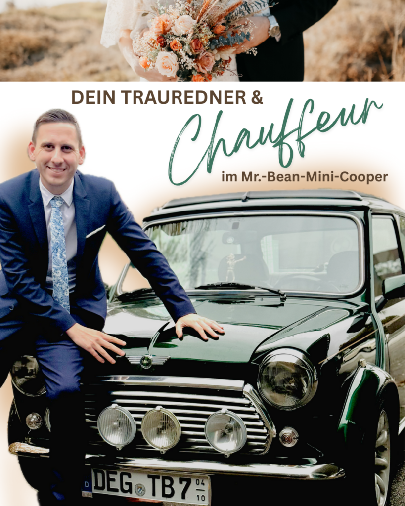 Ihr seid noch auf der Suche nach einem passenden Brautauto für eure Freie Trauung? Sofern erwünscht, chauffiere ich euch (von April bis Oktober) in meinem geliebten „Mr.-Bean-Mini-Cooper“ in klassischem British Green zu eurer Location. Natürlich fallen hierfür keine Kosten an!